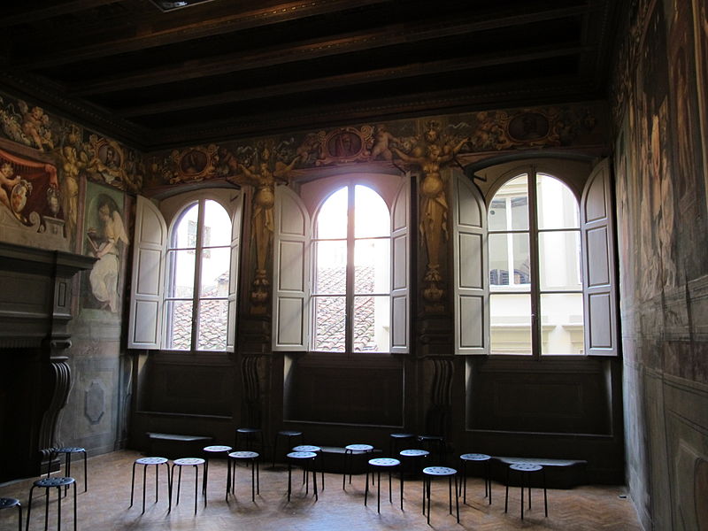 Per entrare in casa Vasari dobbiamo recarci in Borgo Santa Croce, proprio a due passi dalla basilica francescana. Arrivati al civico 8, ci troveremo di fronte a un palazzo a tre piani, con le caratteristiche finestre centinate e le cornici marcapiano: quelle del piano nobile corrispondono al grande salone interno della casa dell’artista, detto Sala Grande o degli Artisti, in cui si trovano gli affreschi. Vi segnalo, per la sua rarità, la finestrella per bambini posta al di sotto della finestra centrale del primo piano.