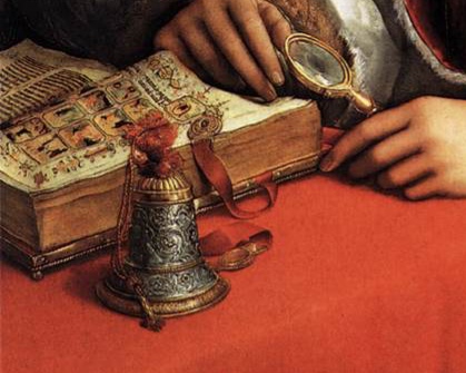 Il papa indossa una bella veste di velluto bianco damascato con la mozzetta3 e il camauro4 in testa e ha lo sguardo rivolto verso l’esterno. Ciò che caratterizza questo dipinto non è solamente l’incredibile realismo – comune a tutti i ritratti di Raffaello e che lo aveva reso un autentico maestro del genere – ma una serie di straordinari dettagli che avevano destato meraviglia anche in Giorgio Vasari, il quale si era lungamente soffermato sull’opera nelle Vite: il riflesso della finestra sul pomello della sedia, la fine decorazione del campanello (“che non si può dire quanto è bello”), la lente d’ingrandimento, le parole scritte sul libro. Un’ambientazione elegante e raffinata che faceva riferimento al mecenatismo del papa, che aveva chiesto al suo artista preferito un ritratto da “umanista”.