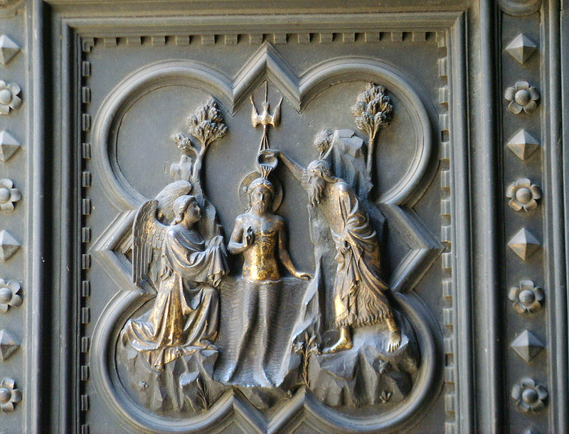 La prima è la Porta sud (1330-1336) di Andrea Pisano, composta da 28 formelle, che raffigurano le Storie della Vita di San Giovanni Battista e le Virtù (teologali e cardinali, con l’aggiunta dell’Umiltà). Ogni pannello rappresenta una storia a sé stante, con scene dallo stile sobrio ed elegante, inserite all’interno delle caratteristiche cornici quadrilobate gotiche.