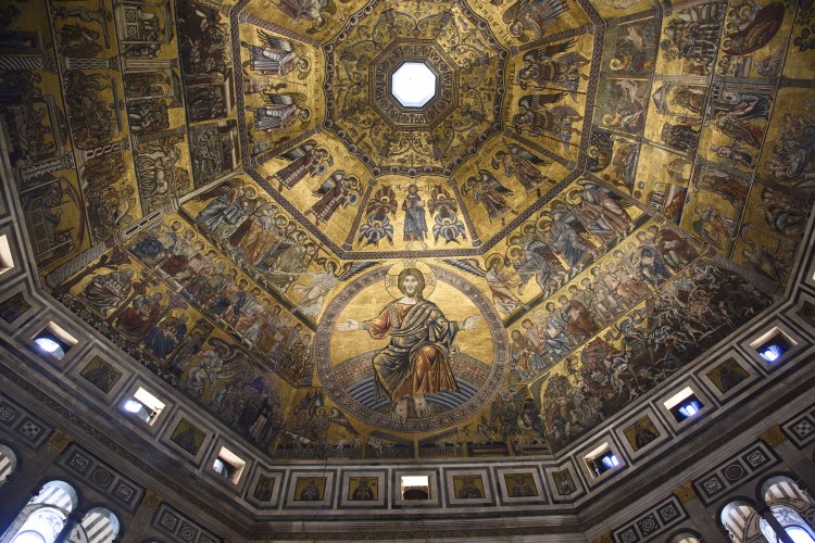 La decorazione interna del Battistero si ispira chiaramente all’architettura classica ed è presente molto materiale antico di recupero, caratteristica comune a tutti gli edifici di epoca romanica. Da notare la presenza del matroneo, il loggiato interno riservato alle donne, tipico delle chiese paleocristiane e mantenuto anche nei secoli successivi come elemento strutturale e decorativo delle navate. Alzando gli occhi verso la cupola vedrete il grande mosaico che si ritiene sia stato iniziato intorno al 1270 e completato circa 50 anni dopo, nel 1330. E’ probabile che, almeno nella fase iniziale, i fiorentini abbiano richiesto la collaborazione di maestranze veneziane (l’arte musiva non era esattamente tra le specialità locali) e che in seguito siano intervenuti vari artisti toscani, tra i quali si citano anche Cimabue e Coppo di Marcovaldo.