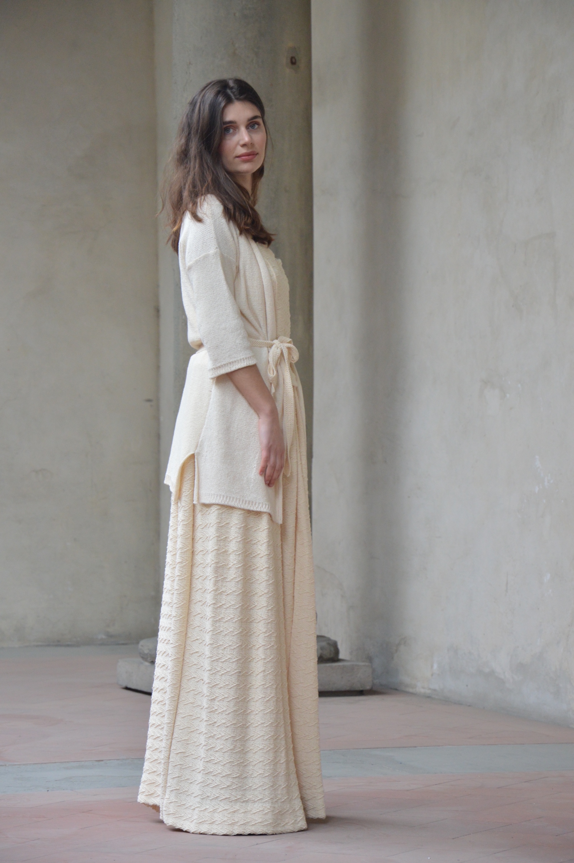 Quali materie usi e cosa produci? <<Uso materiali ricercati e realizzo capi di abbigliamento e accessori, ma anche complementi di arredo e oggetti per la casa. Faccio tutto con le mie mani, mettendo estrema cura e attenzione in ogni singola cosa e per questo la mia produzione non è molto ampia, ma rispetta proprio il tempo della manualità, che è anche il tempo della meditazione e della calma.>>
