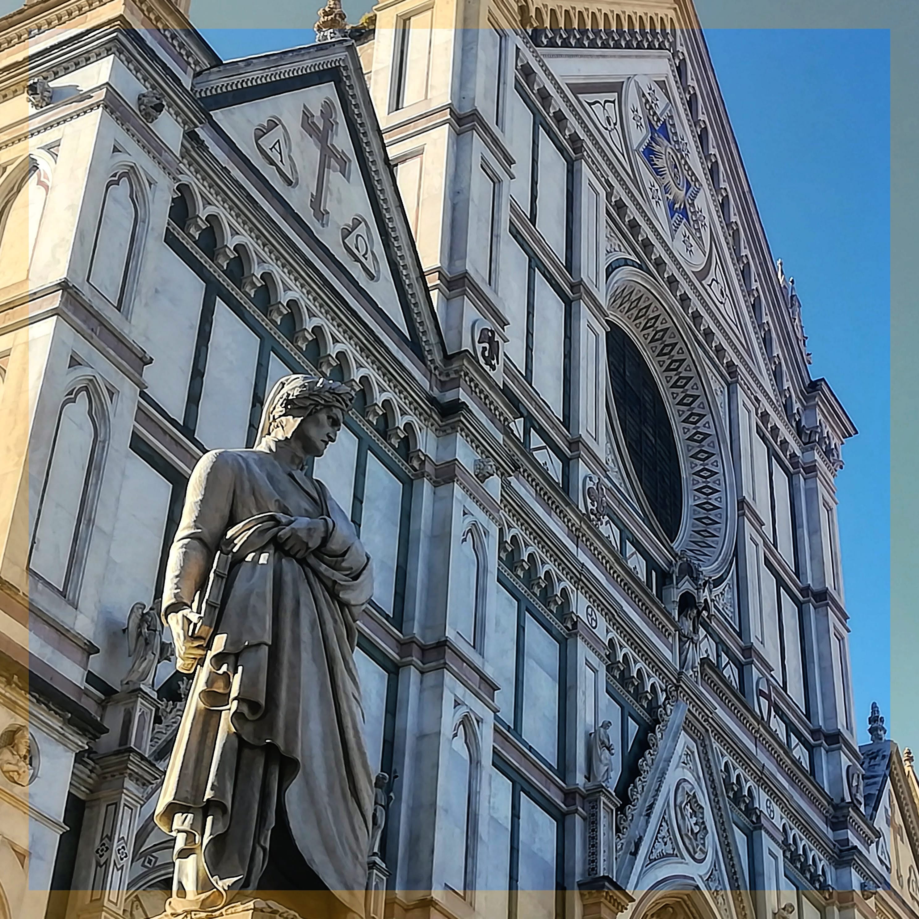 Questo itinerario dantesco finisce in Santa Croce (attenzione perché ce ne saranno altri!); sulla scalinata di fronte alla facciata, vediamo il monumento a Dante Alighieri, scolpito da Enrico Pazzi nel 1865, che lo rappresenta con espressione fiera e severa e la Divina Commedia sottobraccio, mentre i quattro leoni in basso reggono uno scudo su cui è inciso il titolo di altre sue celebri opere. Sapevate che per realizzare questa scultura ci vollero ben 14 anni? Nel 1851 l’artista presentò l’opera alla città di Ravenna (che non accettò per gli elevati costi di esecuzione) e qualche anno dopo la ripropose a Firenze. Così nel 1857 si formò un comitato nazionale per organizzare una raccolta fondi, a cui aderirono molti personaggi noti dell’epoca, tra cui Alessandro Manzoni, Giuseppe Verdi e Bettino Ricasoli. Il monumento doveva essere collocato in una delle piazze più importanti della città e Santa Croce venne scelta per la presenza di tanti italiani illustri sepolti nella basilica: la statua fu posta al centro della piazza e inaugurata ufficialmente alla presenza di Re Vittorio Emanuele II il 14 maggio 1865, in occasione delle celebrazioni per il sesto centenario dalla nascita di Dante (poi spostata dove si trova oggi a seguito dell’alluvione del 1966).