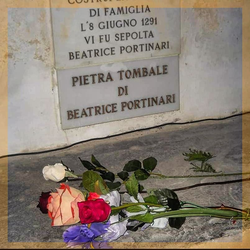 Lungo la parete sinistra, invece, sotto una mensola di pietra, si trova questa piccola lapide bianca considerata la tomba di Beatrice, musa ispiratrice di Dante e identificata con Bice Portinari, una giovane donna realmente vissuta a Firenze in quegli anni, figlia del ricco banchiere Folco Portinari, che nel 1285 aveva fondato l’ospedale di Santa Maria Nuova. Da piccola era vissuta nel palazzo che il padre aveva fatto costruire in Via del Corso e si era sposata giovanissima con Simone dei Bardi (anche lui banchiere), ma il loro matrimonio era durato poco perché la ragazza era morta a soli 24 anni. Dante l’aveva incontrata da bambino, quando entrambi avevano 9 anni e l’aveva rivista solo 9 anni dopo (questo numero ritorna spesso nella sua storia ed è il simbolo del miracolo); probabilmente i due si scambiarono solo pochi saluti, ma il poeta raccontò il grande amore per lei nelle sue prime opere, fino a sublimarne l’esistenza nella Divina Commedia.