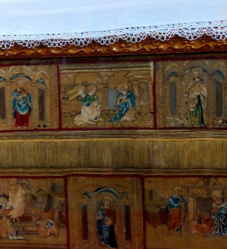 Di mirabile fattura è il paliotto5 d’altare, databile tra il 1460 e il 1465, ornato con scene tratte dal Nuovo Testamento e i cui disegni preparatori erano stati a lungo riferiti a Beato Angelico. Studi più recenti hanno attribuito parte dei cartoni al suo allievo Maso da Finiguerra e a Francesco del Cossa, uno dei maggiori pittori della scuola ferrarese che probabilmente in quegli anni aveva soggiornato a Firenze per apprendere nuove tecniche, come quella della tessitura artistica. È inoltre possibile che i riquadri del paliotto fossero nati per adornare parati liturgici, come piviali e dalmatiche e che poi fossero stati riadattati per comporre questa decorazione.