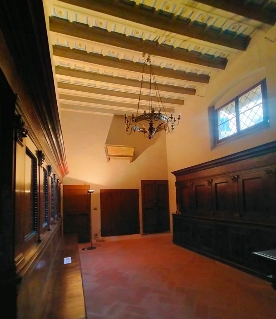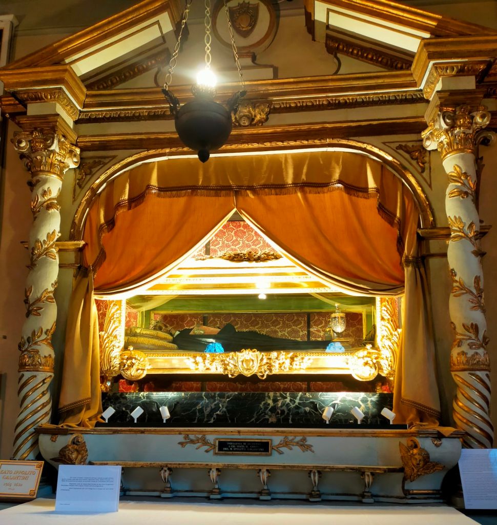 Entrando nella cappella, a sinistra, troviamo una grande urna dorata e trasparente che permette di vedere il corpo del beato Ippolito Galantini ricomposto al suo interno e nella piccola sagrestia attigua ricchi mobili con decorazioni ad intarsio risalenti al XV-XVI secolo.