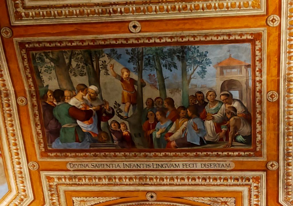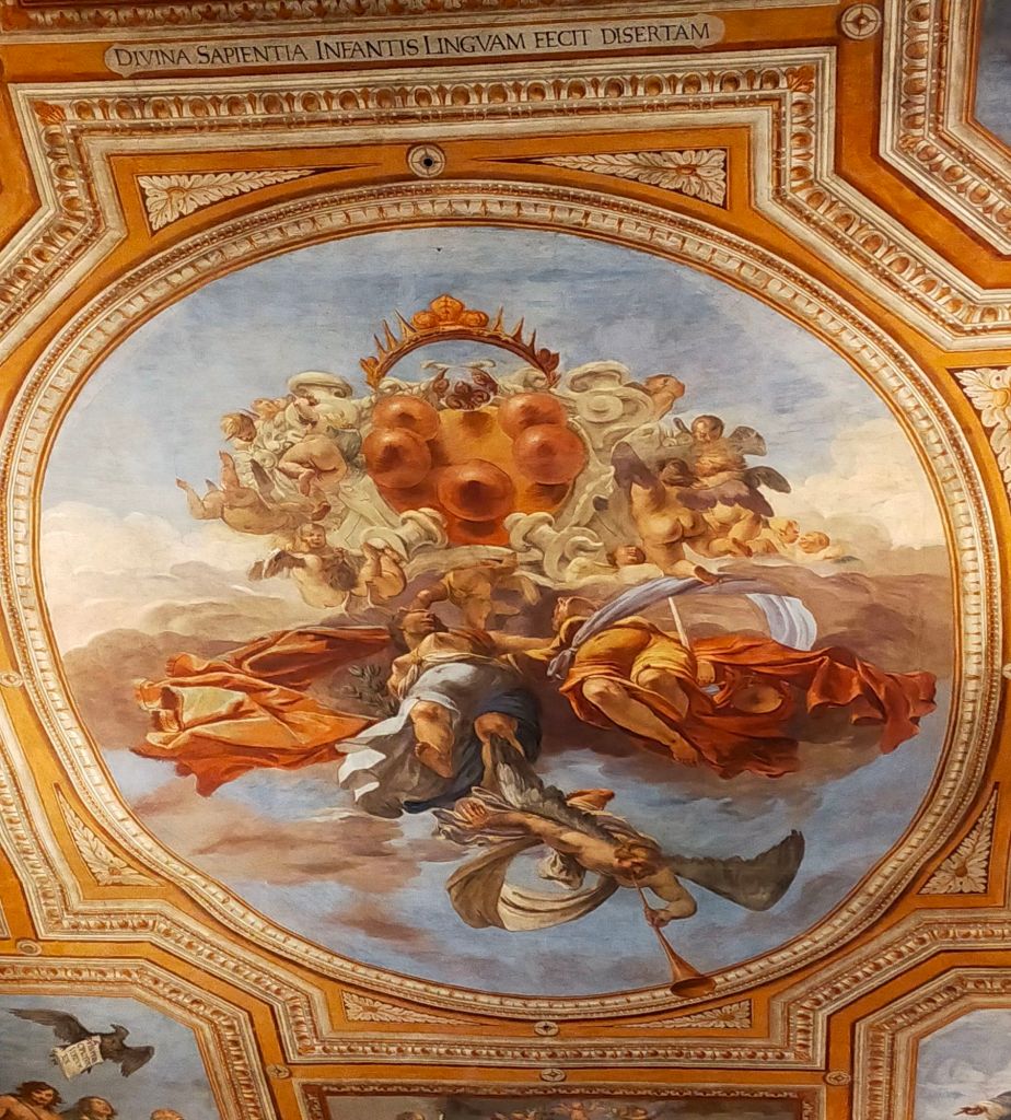 Gli altri riquadri vennero in gran parte dipinti da Domenico Pugliani4, allievo di Matteo Rosselli, che tra le varie scene rappresentò San Francesco in gloria vicino all’ingresso, mentre la Predica del beato Ippolito bambino tra i Santi Ignazio di Loyola, Domenico, Giuseppe e Bernardino da Siena, viene attribuita a Giovanni Martinelli. Da ricordare anche la presenza di Cecco Bravo e Lorenzo Lippi e soprattutto di Baldassare Franceschini detto il Volterrano che eseguì lo scomparto raffigurante San Giovanni Battista, San Giovanni Evangelista e San Filippo Neri. La decorazione venne completata nel 1734 dal fregio eseguito da Niccolò Nannetti e Rinaldo Botti con Virtù, Allegorie e Storie bibliche.