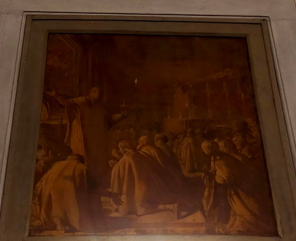 L’ingresso all’aula principale dell’oratorio è preceduto da un ampio vestibolo, progettato da Matteo Nigetti2 e suo fratello Giovanni nel 1620 e costruito grazie alle cospicue donazioni di Maria Maddalena d’Austria, moglie del Granduca Cosimo II, che finanziò anche i lavori per la facciata. Per decorare questo ambiente venne realizzata una serie di tele a monocromo che ricordano i momenti più importanti della vita del beato Ippolito Galantini, tra cui le Esequie, che vennero celebrate dall’Arcivescovo Alessandro Marzi Medici3 all’interno di questo edificio. Nella scena è ben visibile il catafalco su cui era stato posto il feretro, per proteggerlo dalla grande folla che si era accalcata nell’oratorio durante il funerale; negli anni, infatti, Ippolito aveva accresciuto la sua fama anche come guaritore e molte persone avrebbero voluto toccarne il corpo, che quindi dovette essere sistemato più in alto durante la funzione.