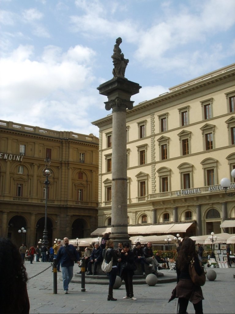 Quella più famosa, forse, è la Colonnadell’Abbondanza o della Dovizia nell’odierna Piazza della Repubblica. Già presente in epoca romana al centro del forum, venne collocata nell’area del Mercato Vecchio nel 1431, sormontata da una scultura di Donatello che nel 1731 cadde a terra per un cedimento del fusto e fu rimpiazzata da una copia del Foggini. La colonna fu sostituita, ma alla fine dell’Ottocento, durante i lavori di Risanamento, venne smontata e riportata qui solo nel 1956.